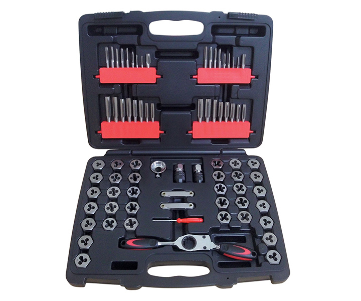 M3X0.5, M3X0.6, M4X0.7, M4X0.75, M5X0.8, M5X0.9, M6X1.0, M7X1.0, 8X1.25, M9X1.0, M9X1.25, M10X1.25, M10X1.5, M11X1.5, M12X1.5, M12X1.75, 1/8BSP28, 4NC40, 6NC32, 8NC32, 10NC24, 10NF32, 12NC24, 1/4NC20, 1/4NF28, 5/16NC18, 5/16NF24, 3/8NC16, 3/8NF24, 7/16NC14, 7/16NF20, 1/2NC13, 1/2NF20, 1/8NPT27, 1pc. Gear Wrench, 2pc. TAP HOLDER (M3-M6) (M6-M12), 1pc. Die Stock, 1pc. Screw Driver, 2pc. Screw Pitch Gauge