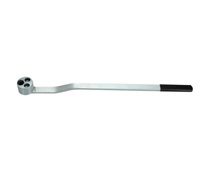 Hand held crankshaft holding tool with a special designed head profile which permits access via a deep socket to each of the pulley bolts in turn.