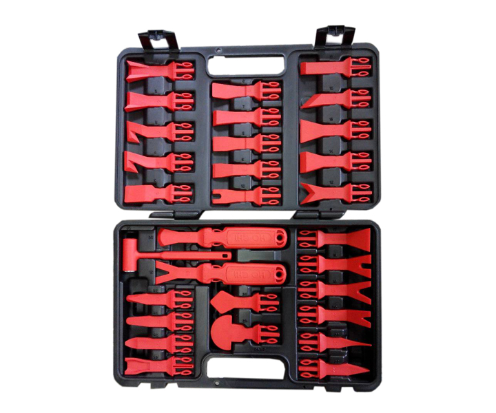 Impact resistant plastic that will not damage surfaces as other tools. Removes most resistant Interior door trim.