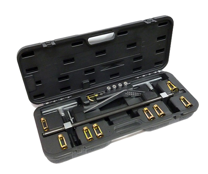 The correct height of the supporting rod may be adjusted due to the adjustment spindles on the left and right side, to achieve the correct angle between handle and the pressure piece for compressing the valve-spring.