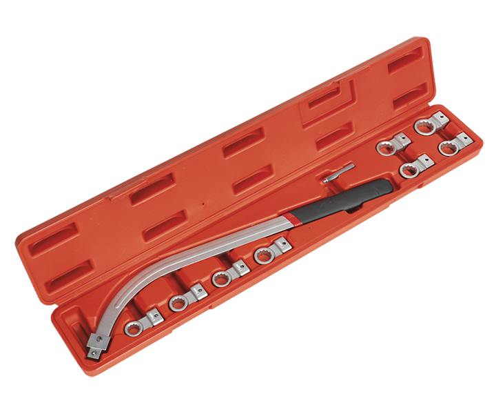 Interchangeable auxiliary and timing pulley belt tensioner wrench kit.